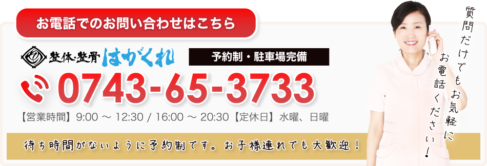 はじめまして。当院のホームページにたどり着いて頂いたことに感謝致します。 あなたはたくさんの健康に関する情報や治療所がある中で自分にあった治療は何かを知るためにたくさんお調べになったのではないでしょうか? 私たちカラダの専門家があなたのお悩みを解決しますのでご安心ください。 当院ではあなたとの問診と検査に重点を置き、初回であなたのカラダのクセや習慣から原因となることをピックアップします。原因がわかればあとはそのポイントを施術するだけであなたのお悩みは解決されることでしょう。 もうどこに行けばいいか悩む必要はありません! ちょっとだけ勇気を出してお電話ください。初めての場所って電話するの緊張しますよね(笑)私たちも同じです! お電話では、まず「整体・整骨はがくれです」と電話をとりますので、「初めてです。ホームページを見て電話しました」とお伝えください。あとはあなたの症状・お悩みを伺います。そしてお名前とご希望の日時を聞いて予約させて頂きます。もし急に予定が変わってしまっても予約の変更の対応をさせて頂きますのでご安心ください。 それでは、あなたのご来院をお待ちしています。